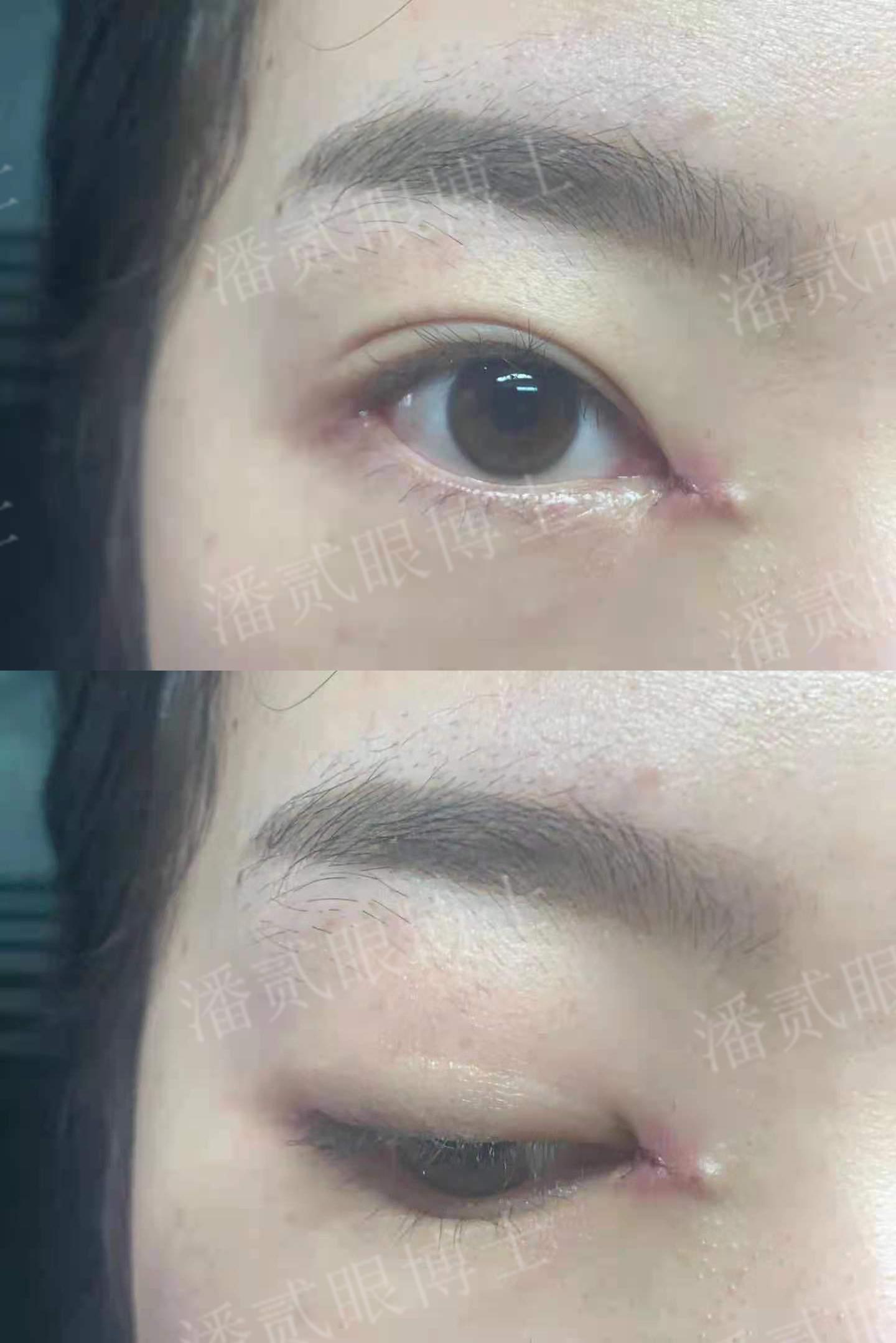比如这位来自四川的小姑娘,修复前的双眼皮外观整体不算太差,但一侧内眼角过大,外眼角的睑缘外翻,有明显漏红。