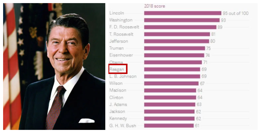 2018年,美国公布了一份由普通民众评选的历任总统排名,1981年入主白宫的里根高居第9。而排在他之前的,大都是些美国建国时期的“上古先贤”和二战时期的“战斗英豪”。