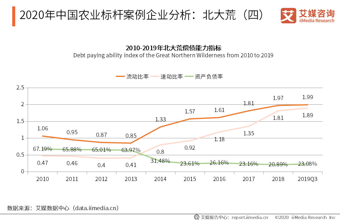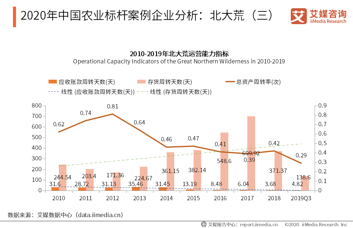 艾媒咨询分析师认为,从2010-2019年北大荒的运营能力指标数据来看,北大荒的总资产周转率不断下降,公司对资产的营运能力减弱;公司的应收账款周转天数持续下降,短期的偿债风险有所减小;自2017年开始公司重点推进农业供给侧结构性改革,存货周转天数有所下降,企业实际变现能力增强。