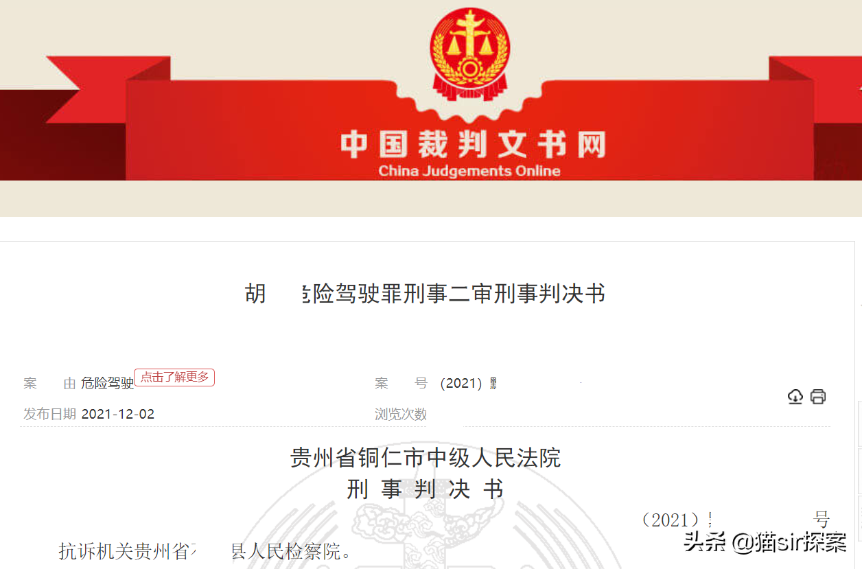 最终,2021年10月29日,贵州省铜仁市中级人民法院认为:胡某犯危险驾驶罪,判处拘役一个月,缓刑二个月,并处罚金人民币三千元。值得注意的是,此次审判通过网络直播审判,接受了社会大众的监督。