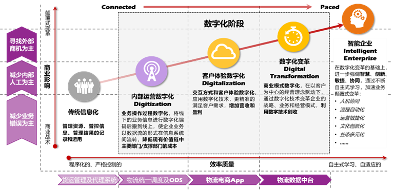 进入数字化之后虽然增加了系统的自动化、提升了效率,但是也造成数据和信息的多元化及基于海量数据的人工判断压力。智能化则成本解决办法、且已成为企业发展的必然趋势。企业智能化进程包括信息化、数字化、智能化三个阶段,其中智能化是企业的高阶形态。在数字化变革的基础上,其进一步强调智慧、创新、敏捷、协同,通过不断自主式学习,加速业务颠覆式变革:人机协同、流程自动化、运营敏捷化、文化创新化、业态多元化等等。从简单的程序严格控制的状态,转变为自主学习及自适应的人机协作的平衡状态。