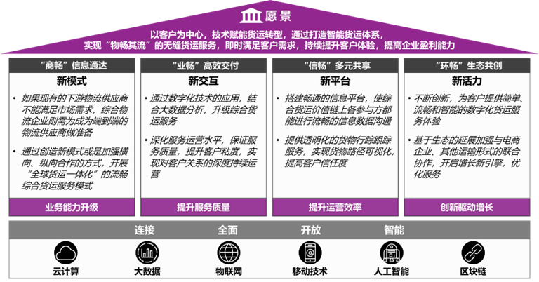 新模式——“商畅”信息通达:如果现有的下游物流供应商不能满足市场需求,综合物流企业则需为成为端到端的物流供应商做准备;通过创造新模式或是加强横向、纵向合作的方式,开展“全球货运一体化”的流畅综合货运服务模式。新交互——“业畅”高效交付:通过数字化技术的应用,结合大数据分析,升级综合货运服务;深化服务运营水平,保证服务质量,提升客户粘度,实现对客户关系的深度持续运营新平台——“信畅”多元共享:搭建畅通的信息平台,使综合货运价值链上各参与方都能进行流畅的信息数据沟通;提供透明化的货物行踪跟踪服务,实现货物路径可视化,提高客户信任度。新活力——“环畅”生态共创:不断创新,为客户提供简单、流畅和智能的数字化货运服务体验;基于生态的延展加强与电商企业、其他运输形式的联合协作,开启增长新引擎,优化服务。