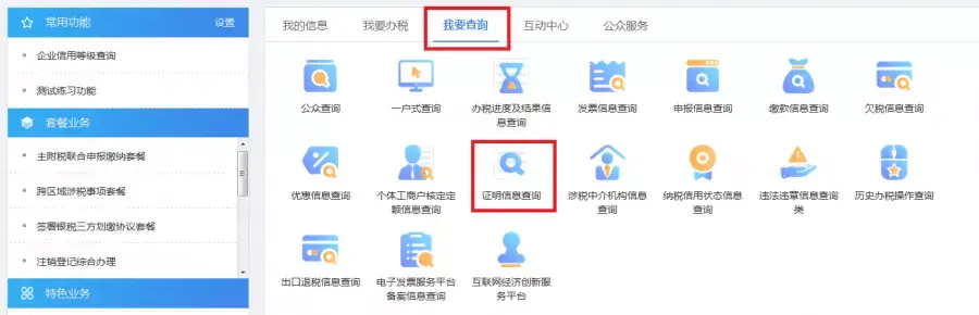 Step1. 缴费人登录电子税务局,点击【我要查询】→【证明信息查询】。