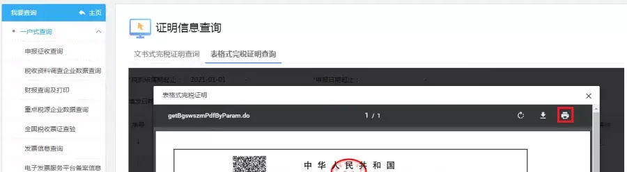Step4. 显示出表格式完税证明后,将光标移动到表格的区域,“打印”图标会显示出来,点击“打印”图标即可打印完税证明。