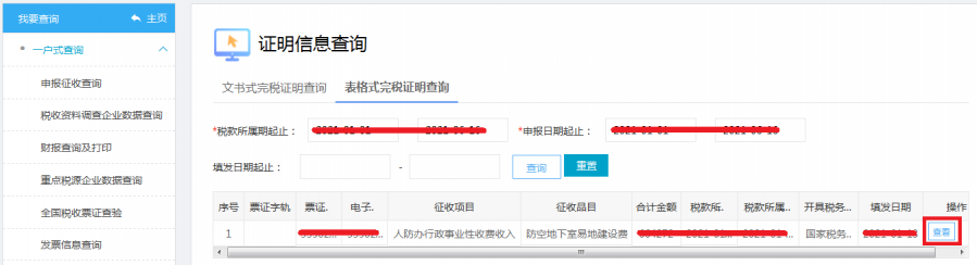 Step2. 进入证明信息查询界面,点击【表格式完税证明查询】,选择所缴费款对应的“税款所属期起止”和“申报日期起止”,点击【查询】。