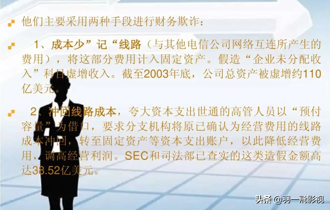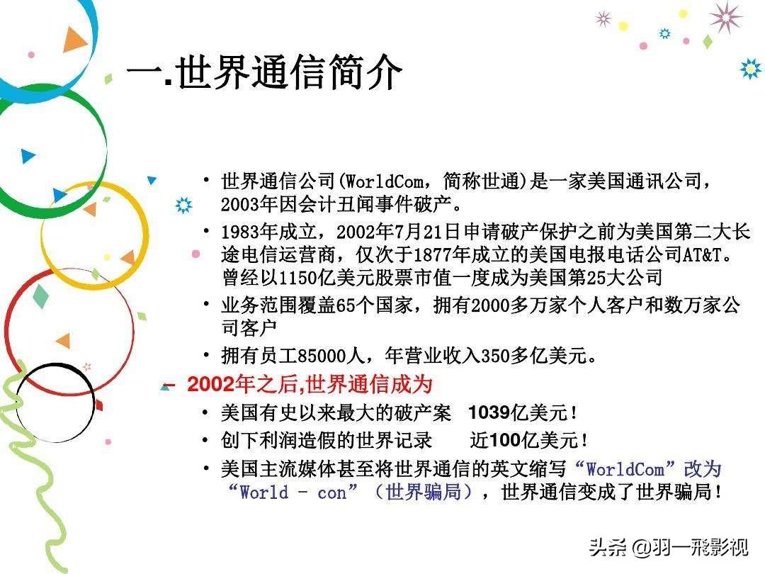世界通信公司是美国第二大长途电话公司,名列世界50大企业,拥有8.5万名员工,业务遍及65个国家和地区。