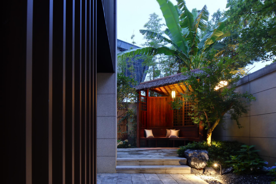 颗粒感十足的铺装搭配工人手工敲凿的石板,充满了静谧的禅意,好似一叶小舟浮游溪上,将两侧的荷叶推开,驶进美好的生活。