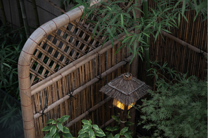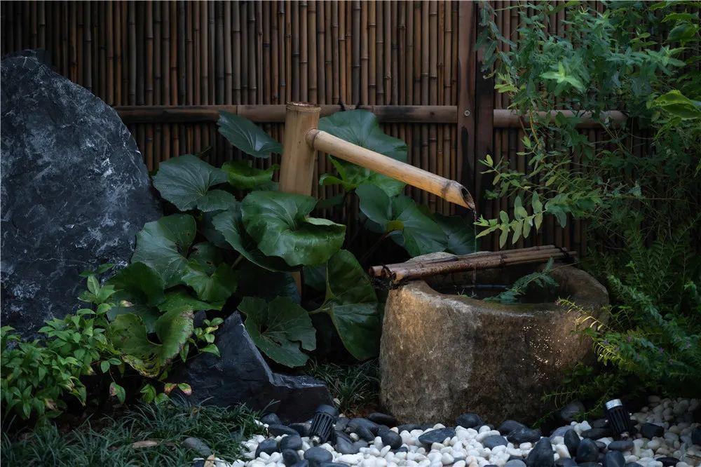 日式景观对植物层次的要求很高,可以没有花,但不能没有木和草。篱笆附近的植物除了美化以外,还具有保护隐私,分割空间的作用。日式蹲踞小巧精致点缀其中,伴以绿植与竹围,洗净杂念。