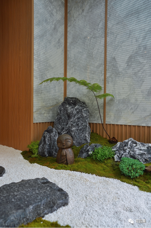 边角的矮石灯笼,笑脸相迎的可爱小和尚,几块前后高低组合的自然景石,微地形上生长着的蕨类景天类小植,砾石和苔藓,一白一绿分明的边界曲线,随手一取景,都是一副精美的构图,简约,不简单。