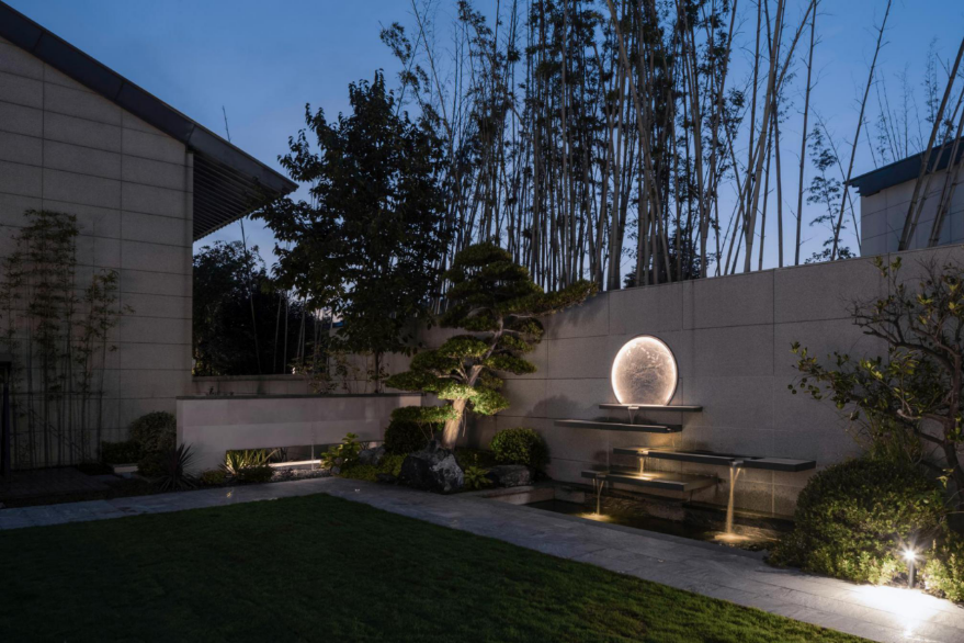 北院围墙设计月洞跌水景墙,围墙外有高大毛竹作为背景,景墙一侧植罗汉松,有松,有竹,有圆月,有墙垣...故而:明月共松风为伴,墙垣与竹影相依。