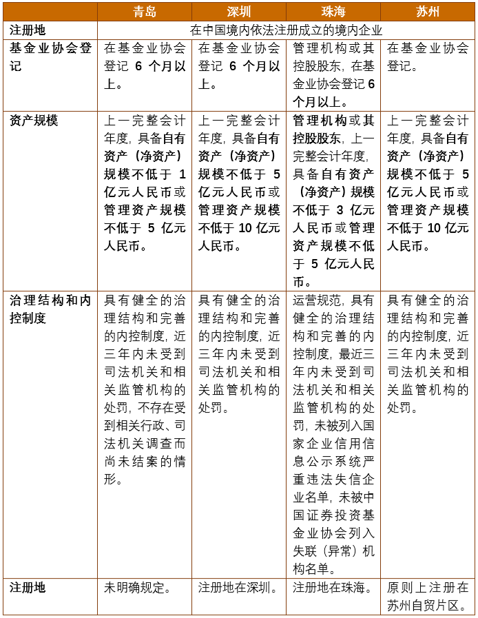 在“内资管外资”的管理模式下,内资管理人参与设立苏州工业园区QFLP基金需要满足在中国证券投资基金业协会(“基金业协会”)登记、资产规模、治理结构和内控制度等方面的条件。与其他试点地区相比,苏州工业园区对其自有资产规模或管理资产规模的要求较高。以下我们整理了主要城市试点政策对内资管理人的相关要求: