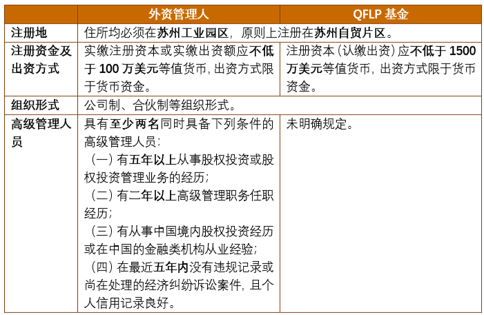 《苏州QFLP办法》对设立外资管理人和QFLP基金设置了一定的条件,相较于其他试点政策,《苏州QFLP办法》要求的外资管理人的注册资金较低,且未明确规定首次出资比例、出资期限等条件,具体如下: