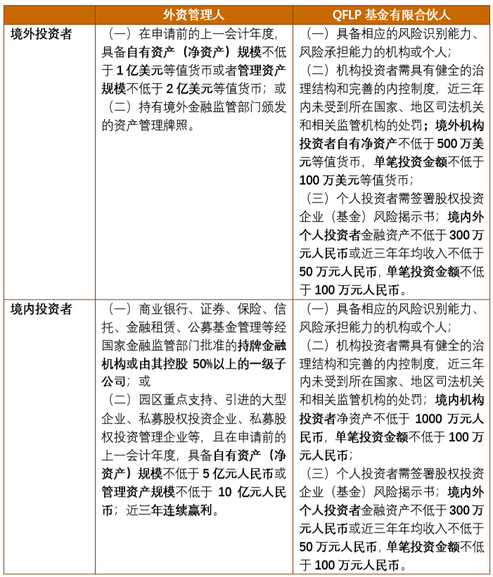 对于境内外投资者投资设立外资管理人和担任QFLP基金的有限合伙人,《苏州QFLP办法》设置了具体的资质条件,其中对外资管理人的境内股东设置了较高的准入门槛,具体如下: