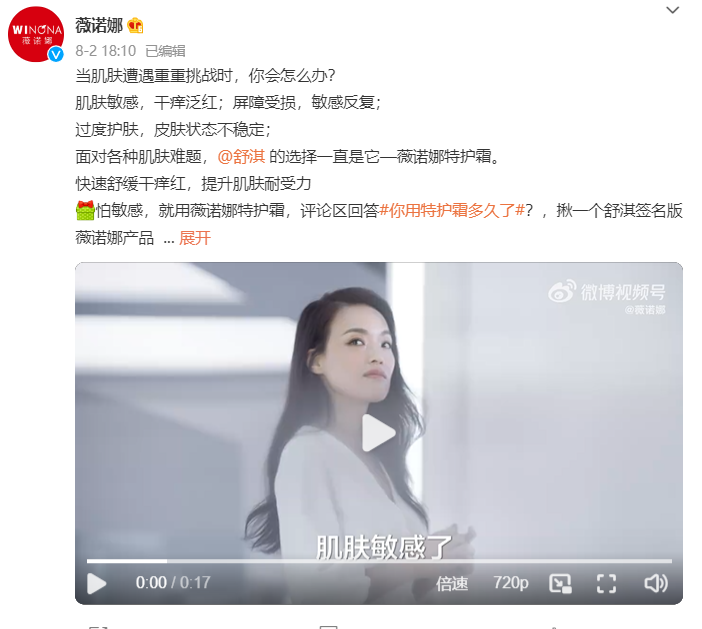 而薇诺娜品牌挚友余承恩在采访过程中,也向粉丝安利了他在长期使用特护霜上的护肤心得。由明星和多平台KOL联合搭建的种草模式,让薇诺娜特护霜进一步引发用户UGC互动,通过用户自发输出,提升了内容曝光度和公信力。