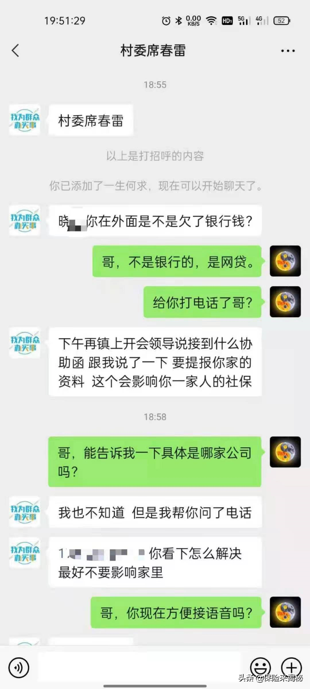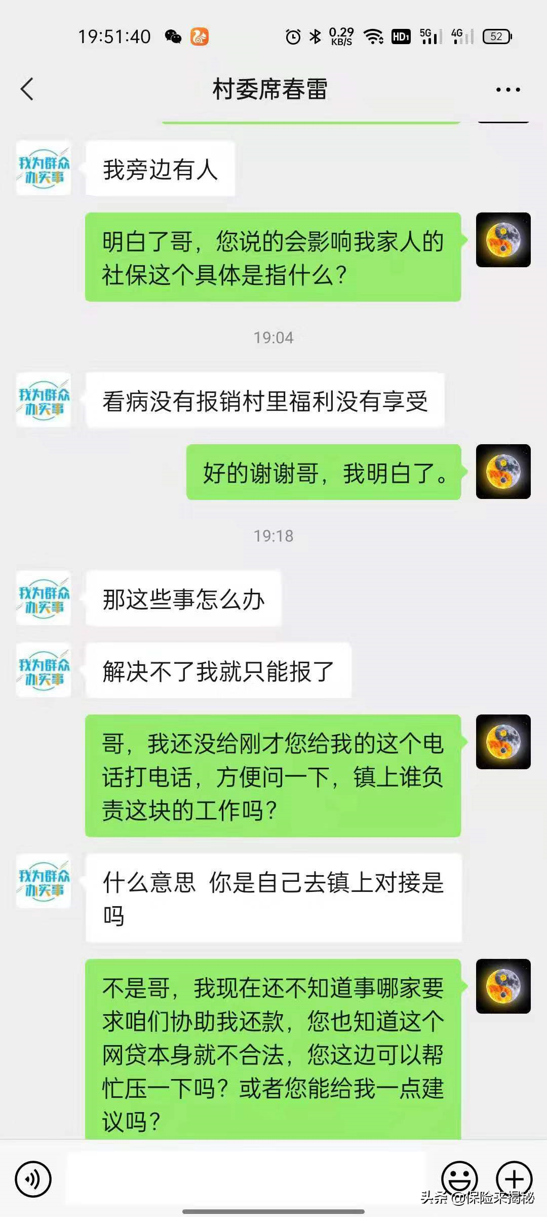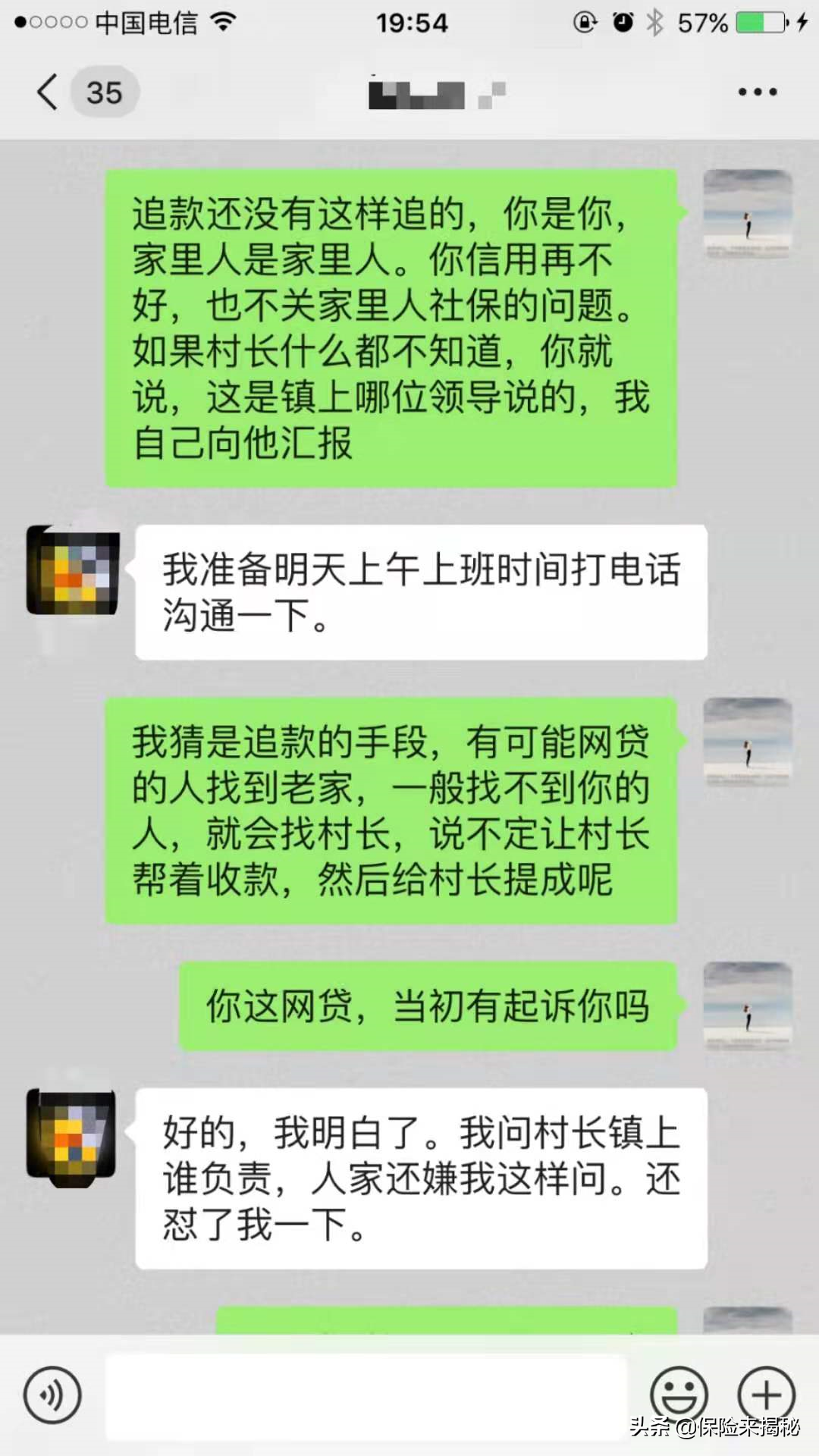 听到小李这样的阐述,我是这样说的,首先是确定加你微信的这个人是村长吗?还有,我怀疑这是一种追款的手段而已,你想一下,哪个村长会关心村民的信用问题?关键是,连镇上领导开会,都把你的逾期问题提上日程?就算吧,就算镇上领导和村长都知道你逾期还不上了,他们有什么权利去阻止你家人的社保不能报销?