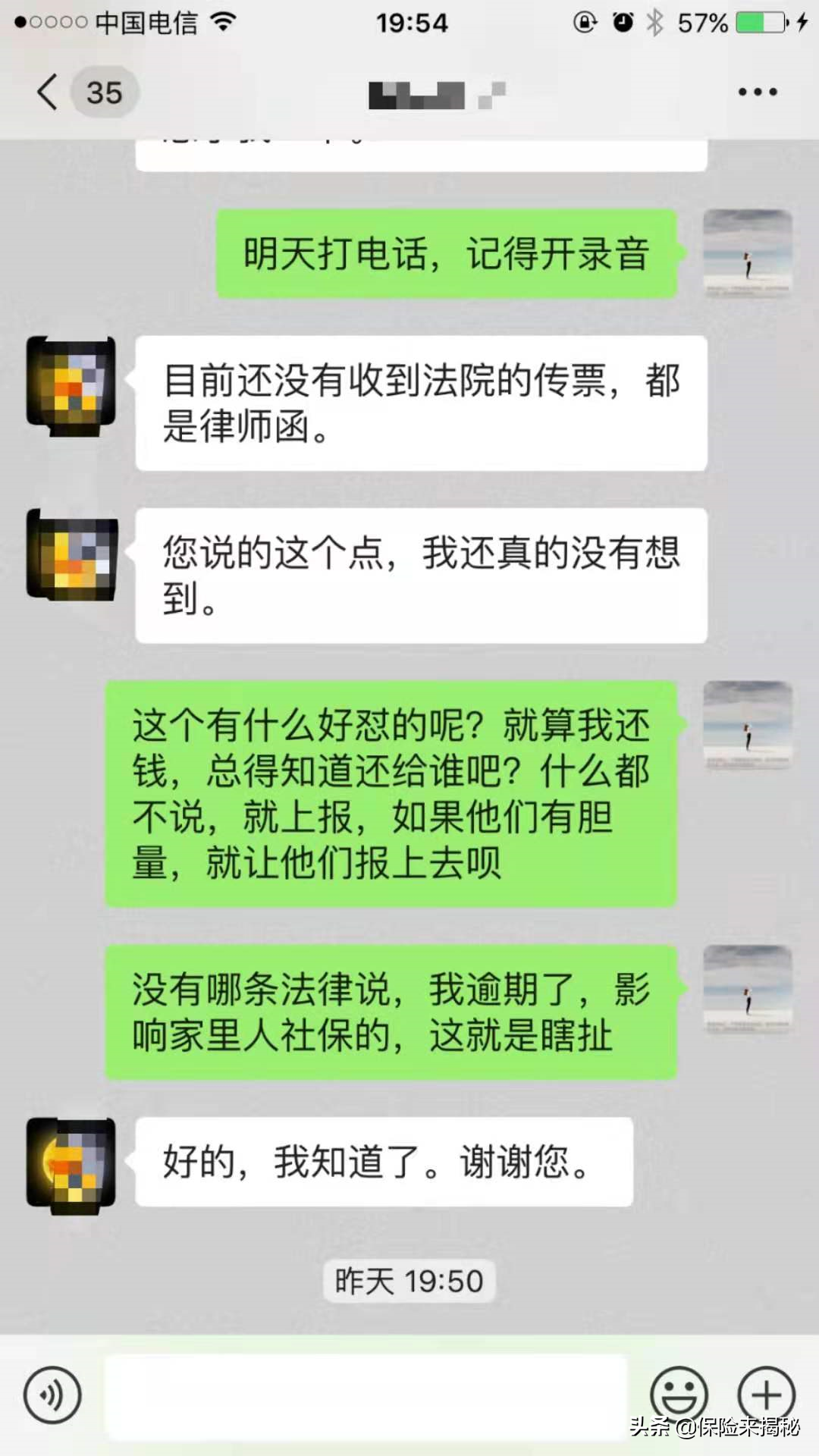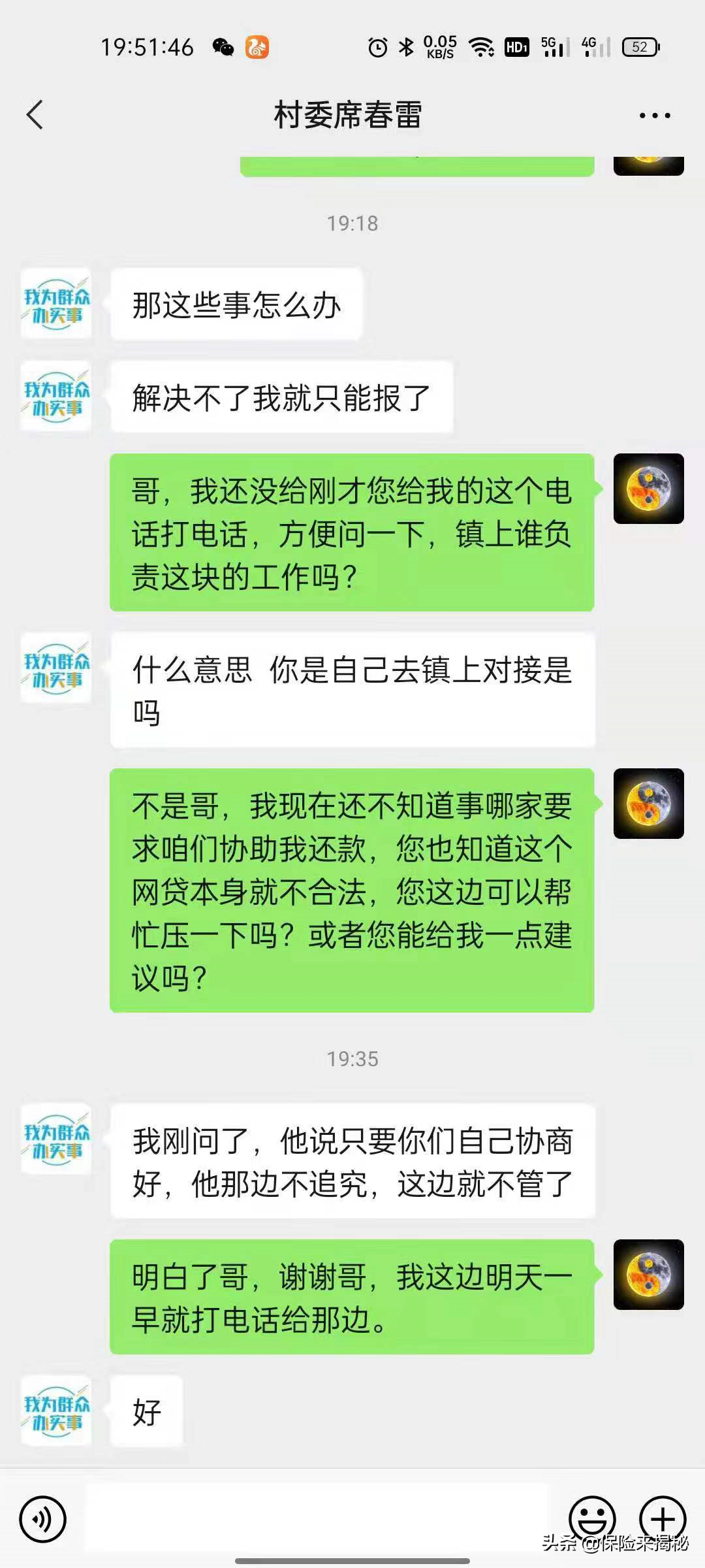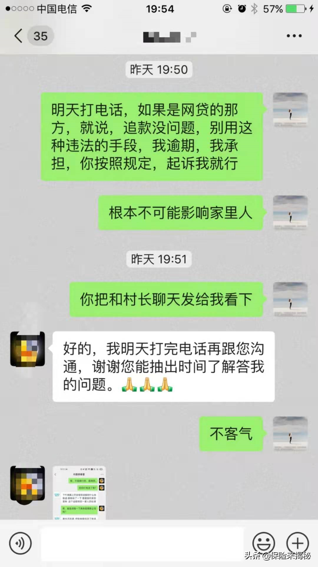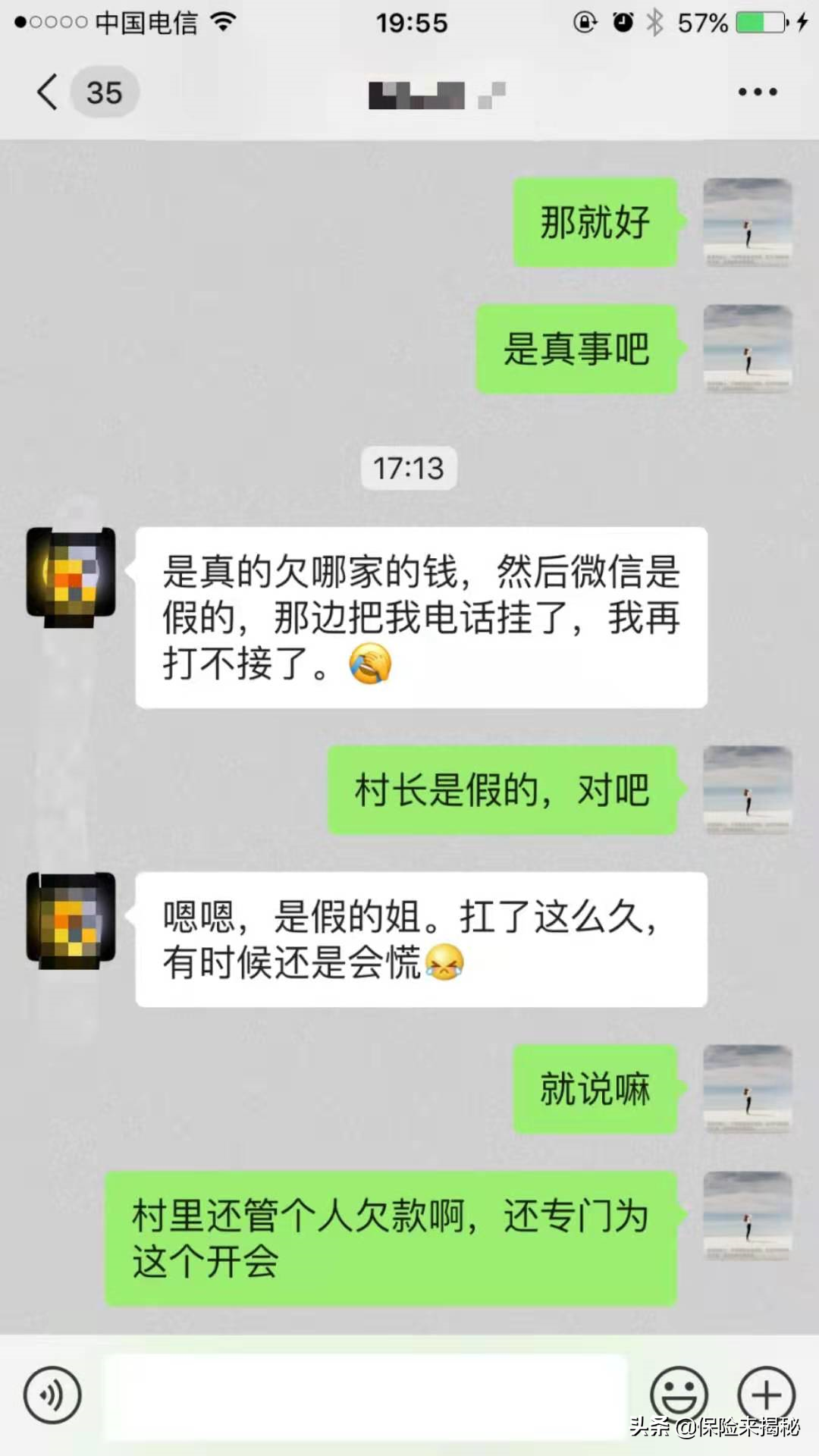 听到小李这样的阐述,我是这样说的,首先是确定加你微信的这个人是村长吗?还有,我怀疑这是一种追款的手段而已,你想一下,哪个村长会关心村民的信用问题?关键是,连镇上领导开会,都把你的逾期问题提上日程?就算吧,就算镇上领导和村长都知道你逾期还不上了,他们有什么权利去阻止你家人的社保不能报销?