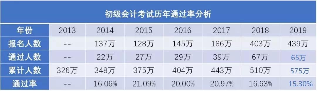 2018年403.6万考生参加初级会计职称考试,68万考生通过考试,经计算,考试通过率大约为16.85%; 2019年439万考生参加初级会计职称考试,较2018年增长8.7%,通过率却仅为15.3%。