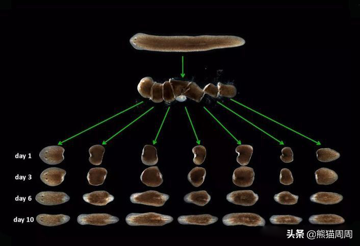 1898年 一个叫摩尔根的生物学家,就开始了对涡虫的再生进行研究,一只涡虫大概279.5mg,他发现把一只涡虫切到只有1.1mg的时候,也就是本体的1/279大小都能再生出来一条完整的涡虫。