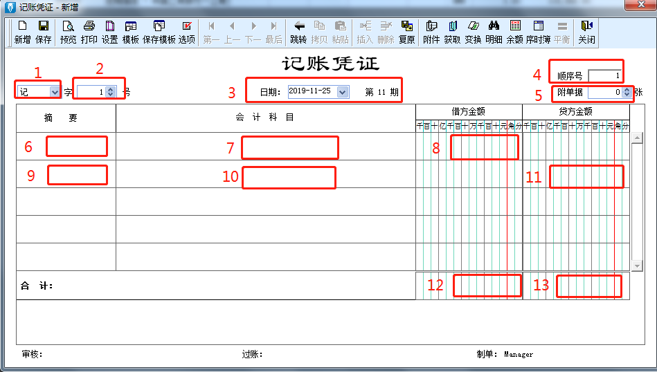 ⑫⑬借方合计和贷方合计金额的填写。一般为自动生成,两边借贷金额必须相等,否则没办法保存。