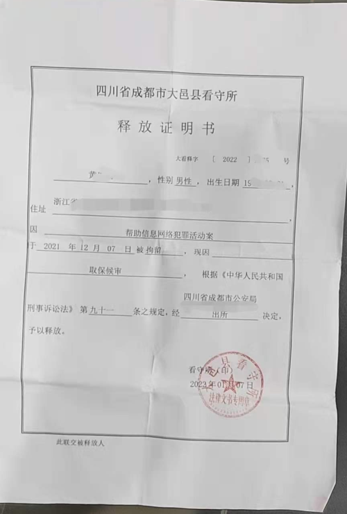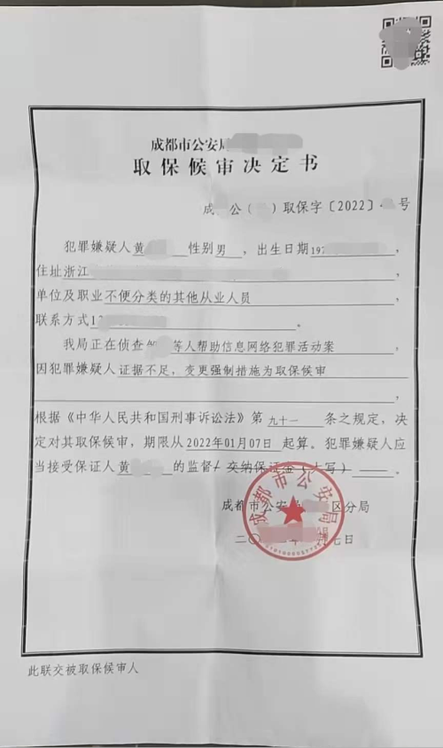 2021年11月,成都朋友因倒卖公司公账银行卡被抓,一个月后的12月3日,H某在其浙江老家被警方以涉嫌帮助信息活动罪抓获,随后押送至成都,关押于大邑县看守所。