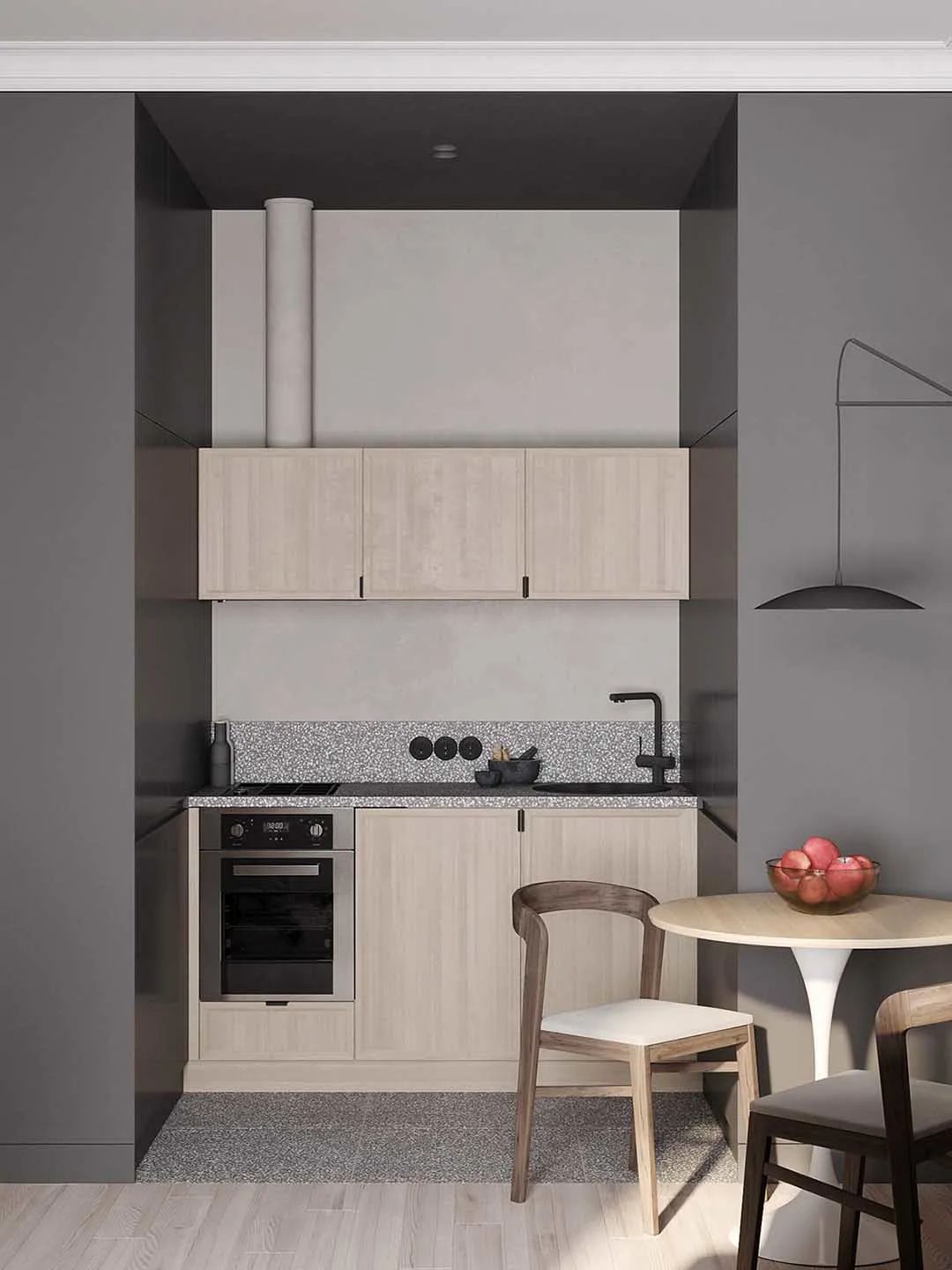 规划在角落的厨房,巧妙地在两侧安装柜体,除了界定场域范围,更赋予收纳功能;