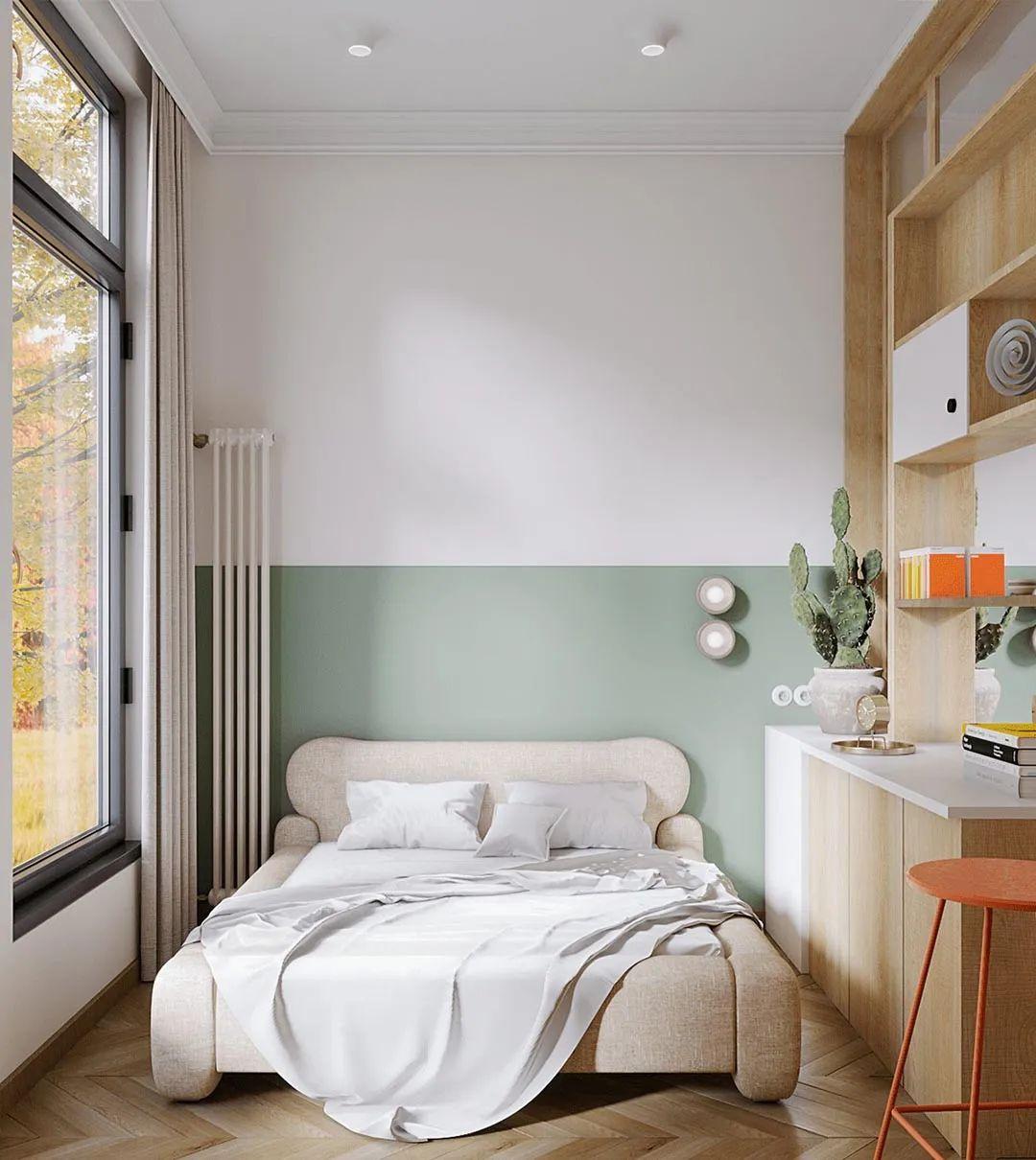 另外,卧室的床头背景墙,除了采用薄荷绿妆点,