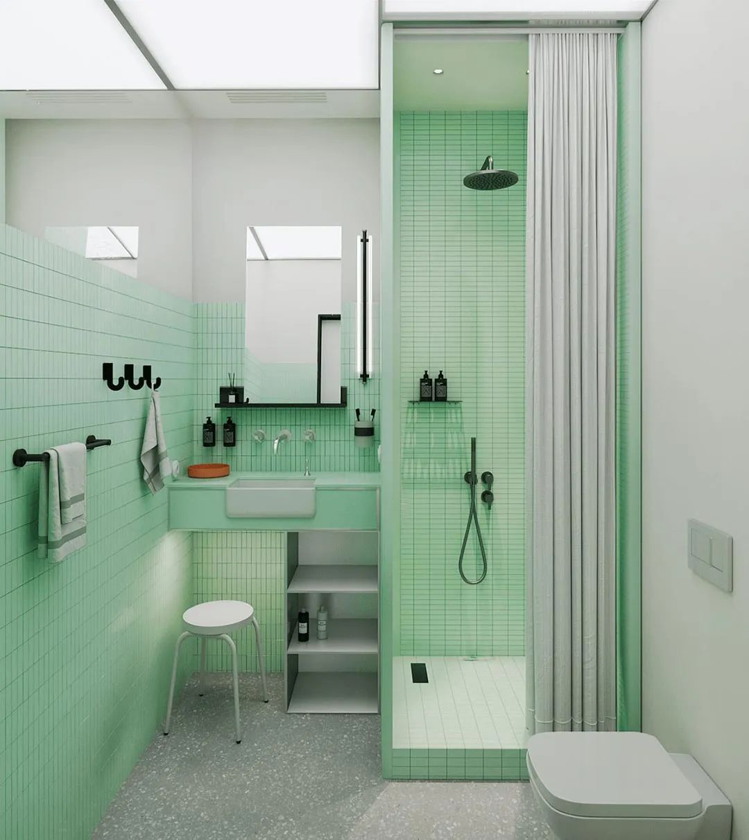不同于公共场域的暖色调,卫生间改用薄荷绿布置,