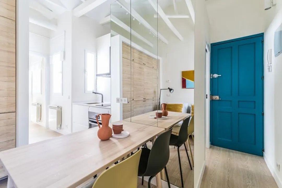 这套小公寓在用色上就显得大胆,而且还是在大面积上使用多种色彩。