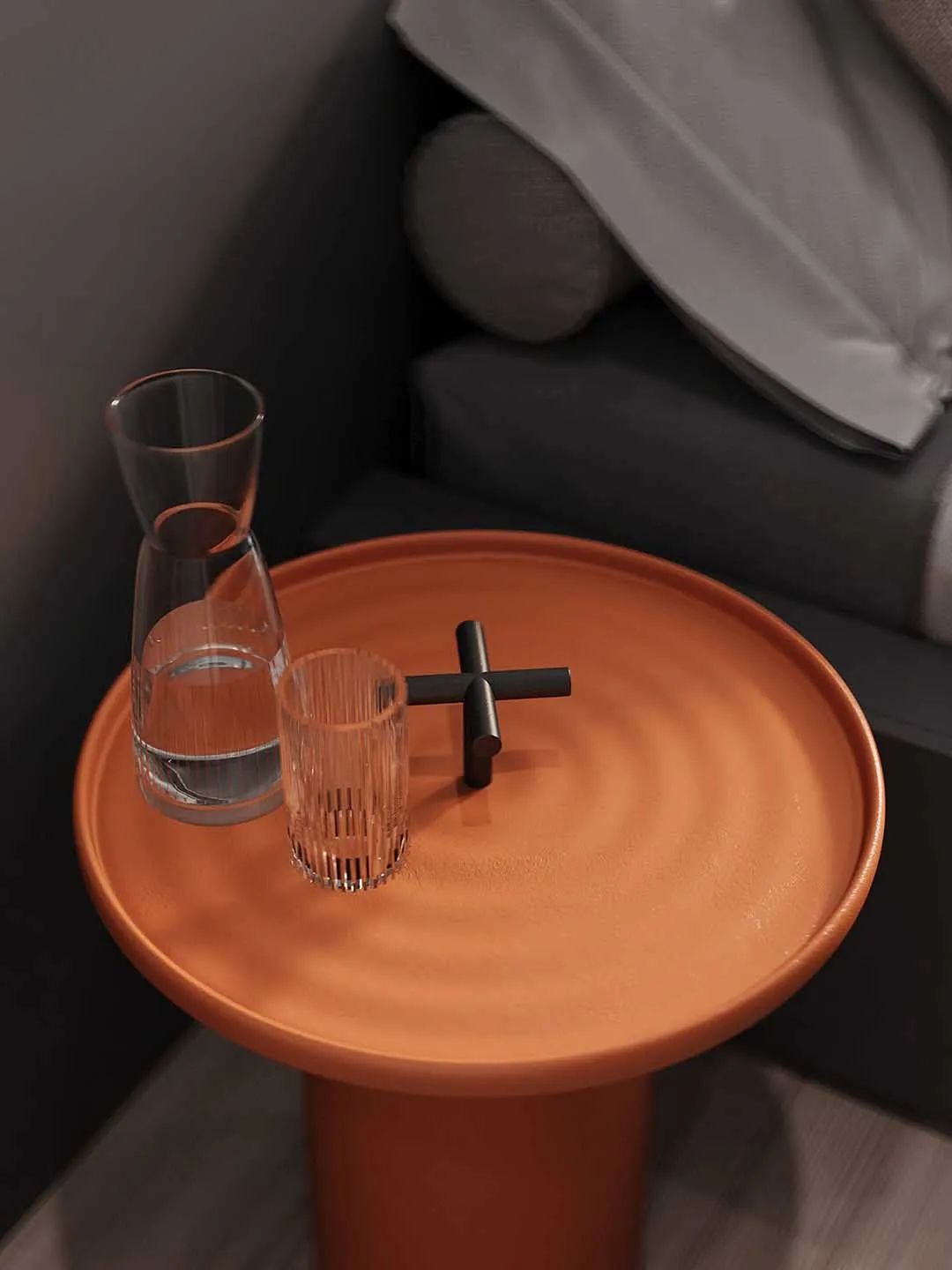在床边放置一张橘色边几,实用又有聚焦的效果。
