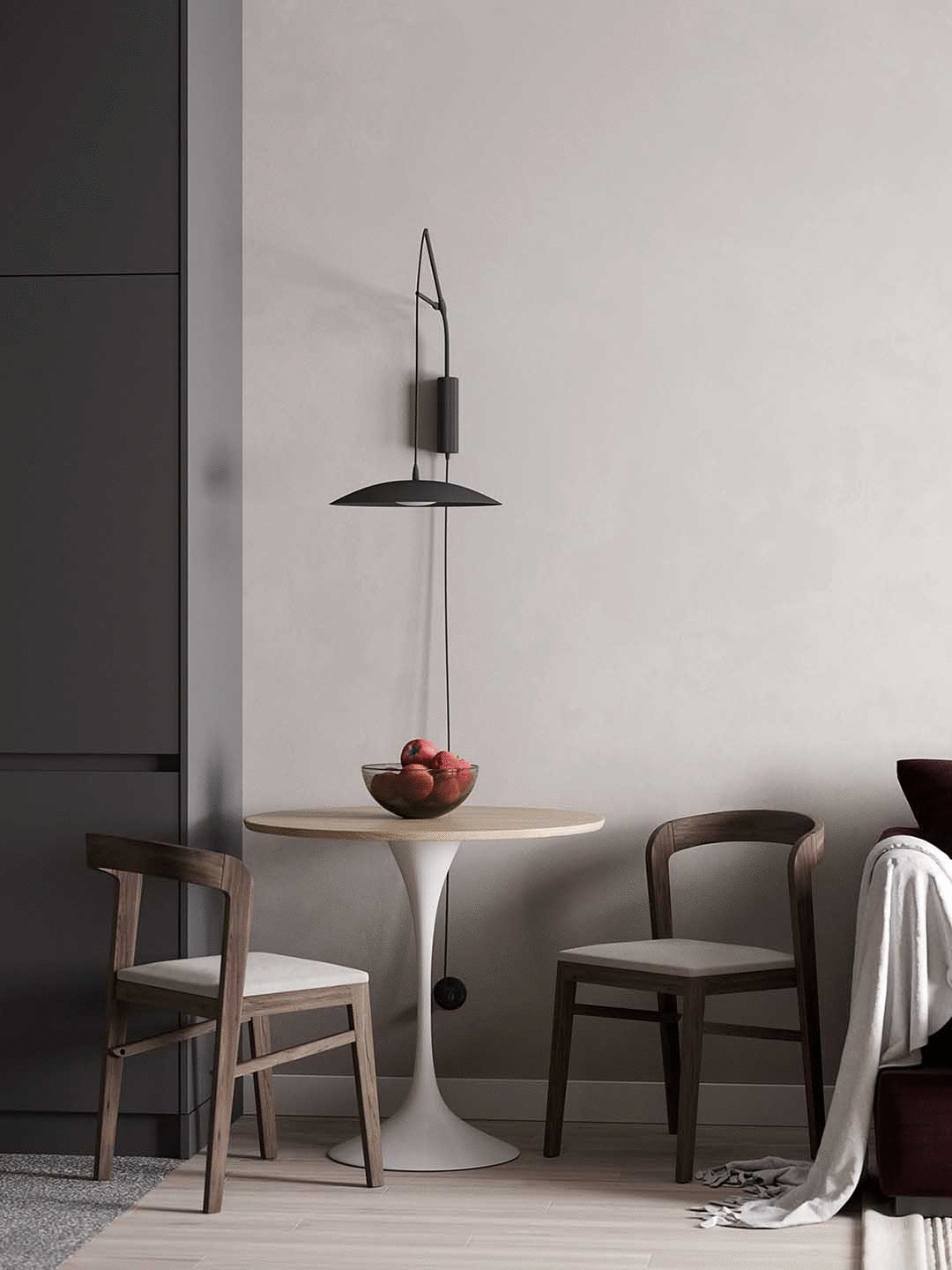 以一张小圆桌、两张餐椅及壁挂式吊灯,
