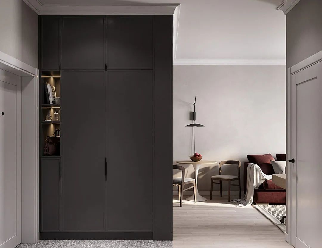 其中,与玄关为界的柜体为双面柜,具备鞋柜、橱柜的双重作用。