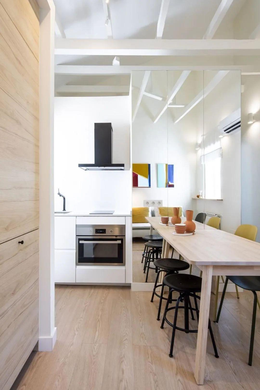 因此设计师在餐桌旁的墙面安装镜子,形成空间放大的错觉,