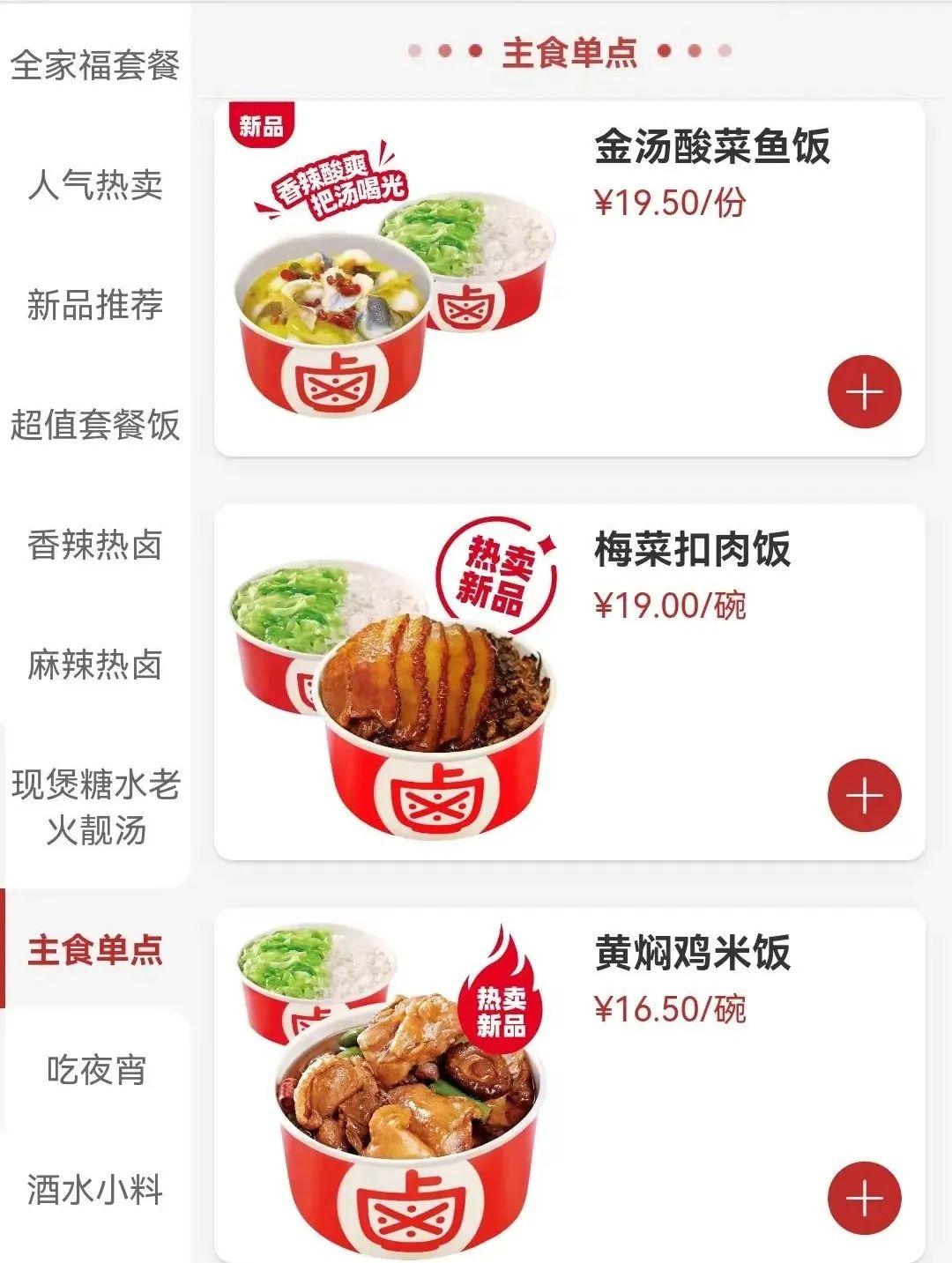 午餐、晚餐时段,则有金汤酸菜鱼套餐、梅菜扣肉鸡汤饭套餐、肥牛饭套餐等主力套餐饭选择,更有卤肉饭三件套、酱骨架三件套等传统卤味餐食组合,超值又能够满足饱腹需求。