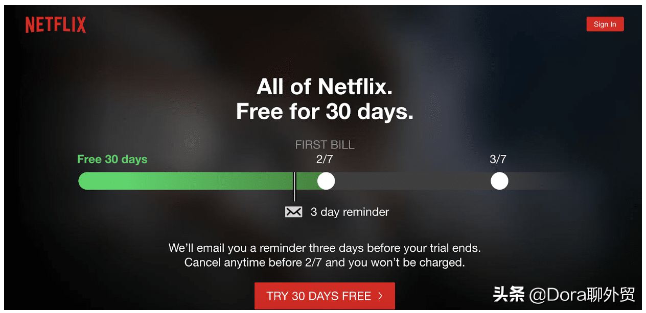 通过动词,落地页清晰地传达了信息以及对客户的期望,从而简化了用户的决策过程,Netflix的这个页面在这点上做得非常好。进入页面,单击按钮“免费加入一个月”。