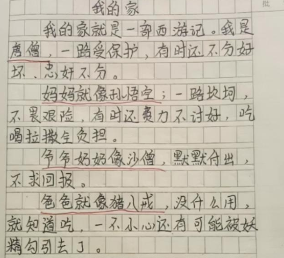家是一个写作文和日记中高频率出现的话题,不过说自己家像西游记的学生还真少见,这位小学生用西游记人物代表家人们,阐述家庭版西游记。