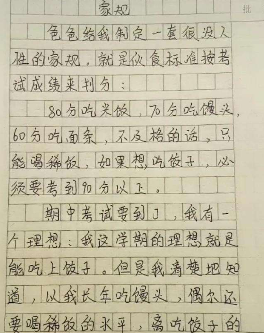 小学生在日记中写到爸爸给他制定了家规,新学期将按照学生考试的分数来决定伙食等级,这个方法家长可以学起来。