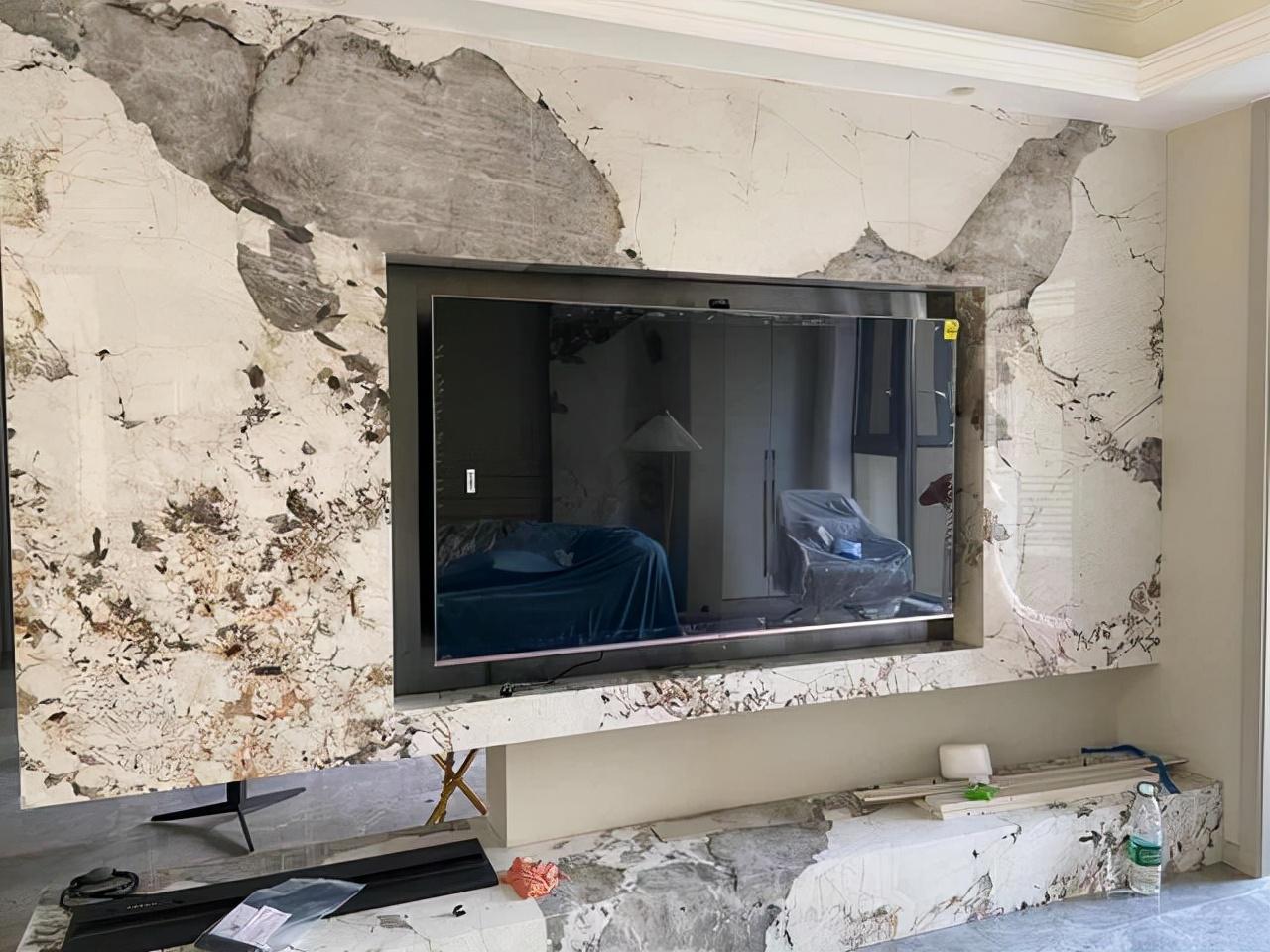 但这种潘多拉大理石花纹的岩板,跟风真的要谨慎!整块潘多拉岩板的效果不错,上墙后做这种电视背景墙,由于电视机内嵌部分破坏了它的美感,就变成了大型“翻车”现场。