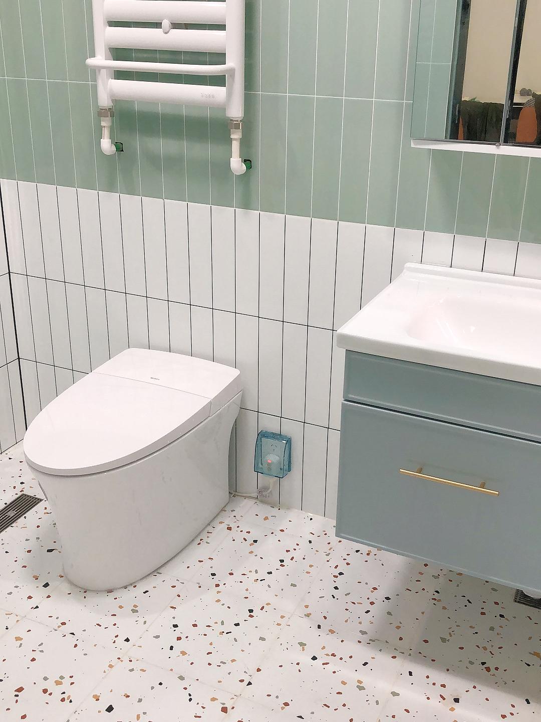 浅色调的水磨石运用在卫生间,一定不要大面积使用,否则很容易喧宾夺主。