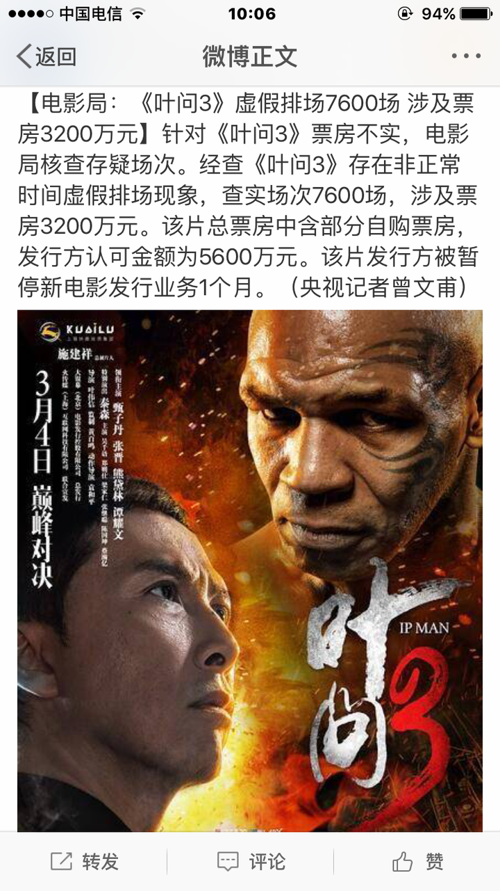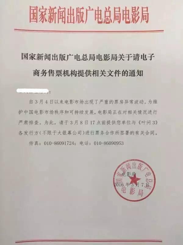 上映4天,《叶问3》就拿下了5亿票房。终于到了3月6日,广电总局电影局严正表态,7日,《叶问3》的相关参与方被广电总局电影局约谈。当晚,广电总局电影局发布通知,称将对3月4日以来电影市场出现的严重的票房异常波动进行严肃排查,并要求相关发行方提交与《叶问3》发行方签署的发行合同。