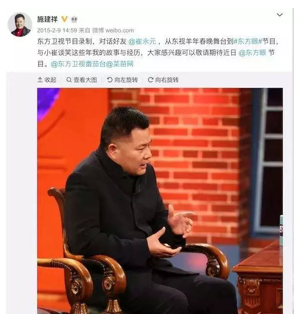 崔永元曾经在东方卫视有一档专栏《东方眼》,邀请了施建祥做嘉宾。东方电视台的春晚,施建祥是总策划,崔永元是主持人。