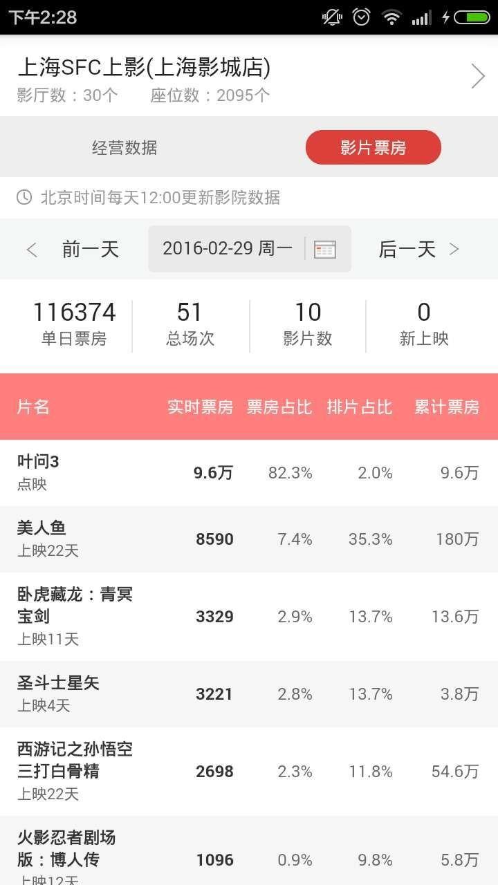 上海SFC上影(上海影城店)当天票房出现异常。当天《叶问3》的票房是《美人鱼》的3倍,达到了9.6万元。