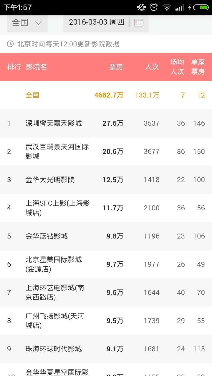 到了3月3号,正式上映,上海影城以及3个金华的影院,打败了诸多北上广深影院,齐齐进入全国票房前十。
