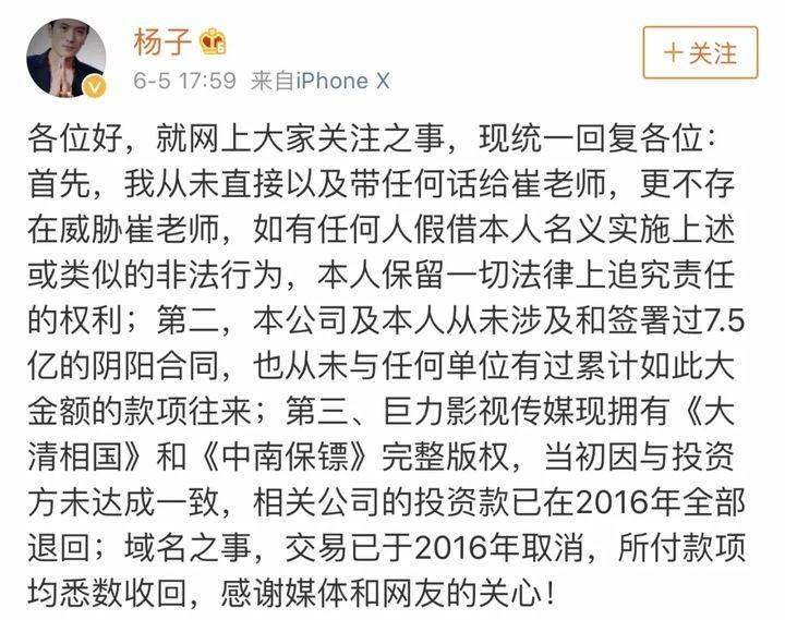 随后崔永元爆料的“一对演员夫妇7.5亿合同”,牵出了杨子、黄圣依。当记者问到,“7.5亿演员夫妇是不是杨子和黄圣依”的时候,崔永元竟然回复:“我揭露那堆卷走七亿五点演员夫妇,已经托人给我带话了,要废我”。随后在记者的一再追问下,崔永元说,“那就说吧,杨子放话了,要杀我”。