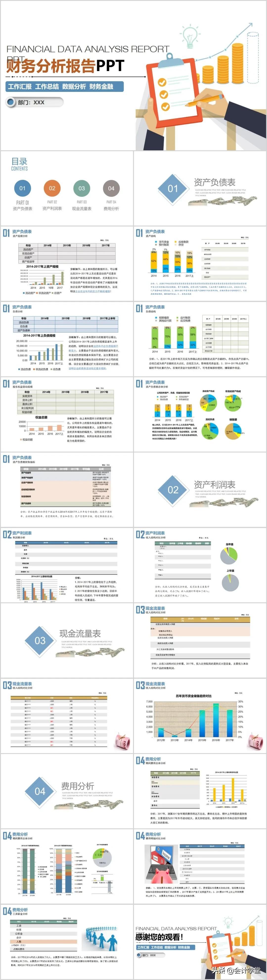 10套财务分析报告,制作精美,内容完整,包含:财务报表分析、应收应付分析、费用分析等内容。适合自学和内部财务人员培训使用。部分PPT截图展示如下: