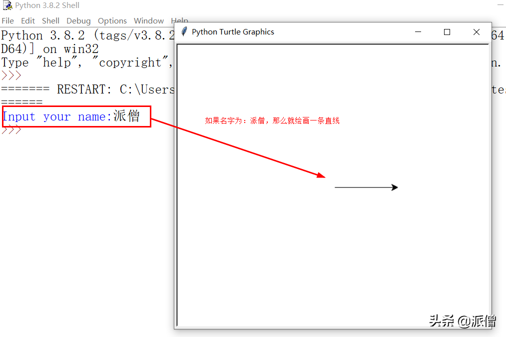 如果输入名字为“派僧”,那么小海龟(turtle)就会绘制一条直线