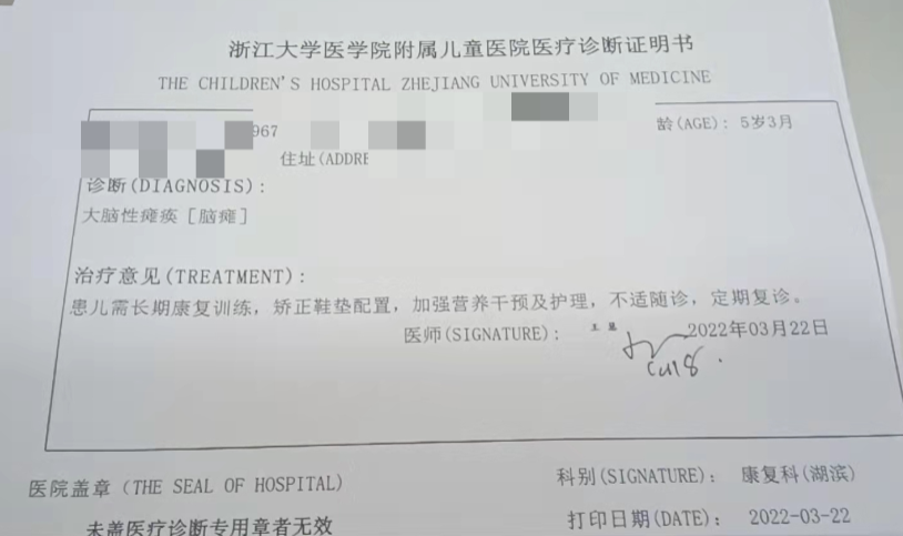 浙大医学院附属儿童医院诊断证明书显示,孩子诊断为大脑性瘫痪,需长期康复训练,矫正鞋垫配置,加强营养干预及护理,需定期复诊。
