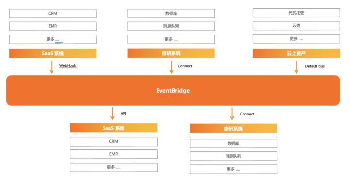 EventBridge 支持云上数据库、云上消息队列、云产品事件对接 SaaS 系统,完善企业用户建设应用一张网的诉求,打破企业应用发展的时间和空间界限,协同企业原有核心资产与 SaaS 系统,构建可演进的企业 IT 架构。