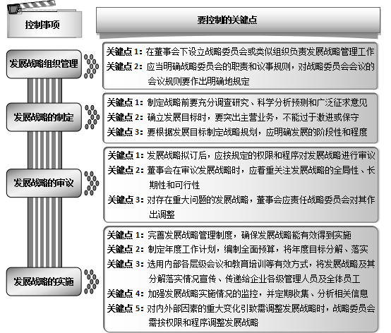 针对发展战略管理存在的上述风险,企业在实施发展战略内部控制的过程中,应至少加强如图2-2所示的关键点控制,以避免风险的发生或降低风险发生概率。