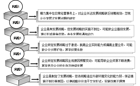 发展战略是指企业在对现实状况和未来趋势进行综合分析和科学预测的基础上,制定并实施的长远发展目标与战略规划。企业在制定与实施发展战略的过程中至少应当关注下列风险,具体如图2-1所示。