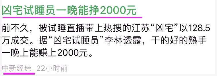 据了解,曾经有平台公开的招募过“凶宅试睡员”,他们的薪酬一般都是按照分钟进行计算的,即使是新手,只要会一些直播,一天基本就可以拿到1440元,如果已经有丰富的经验,那么一天的工资可以达到2000多元。